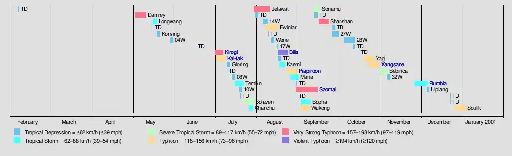 The 2000 Pacific typhoon season marked the first year using names contributed by the World Meteorological Organization. It was a rather below-average season, producing a total of 23 tropical storms, 13 typhoons and 4 intense typhoons. The season ran throughout 2000, though typically most tropical cyclones develop between May and October. The season's first named storm, Damrey, developed on May 7, while the season's last named storm, Soulik, dissipated on January 4 of the next year. The Accumulated Cyclone Energy (ACE) index for the 2000 Pacific typhoon season as calculated by Colorado State University using data from the Joint Typhoon Warning Center was 252.9 units.[1]