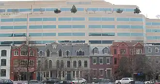 Battles to preserve the row of houses began in October 1976, when the developer who owned several of them began demolishing the house at 2022 I St.[6] Don't Tear It Down (forerunner to the DC Preservation League),[9] a group of historical preservationists organized in 1971 to save the Old Post Office building from destruction,[10] convinced a judge to order a temporary restraining order stopping destruction, as a request to declare the entire block a historic landmark was pending at the time.[6] The developer then attempted, in November, to demolish the house at 2030 I St.; this structure was already listed on the National Register of Historic Places, however, and the state historic preservation officer invoked a delay of 180 days.[6] Discussions with the community did not begin until the 179th day, and a thirty-day extension to the stay was granted.[6] When this expired, the developer began demolition of the house; preservationists managed to get a restraining order in time to preserve the front half of the structure.[6] Citing the requirement for "meaningful discussion" as laid out in a previous historic preservation case, Don't Tear It Down argued that they had not been able to adequately present their case; while the presiding judge stated that "meaningful discussion" was "beyond the court’s comprehension", he nevertheless issued an injunction preventing further demolition before the case could be heard by the DC Court of Appeals.[6] In the event, historic preservation legislation was passed in 1978 before final adjudication, saving the buildings from destruction.[6] The current design of the property is the result of discussions with local preservation groups.[2]