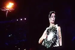 This segment was conceptualised, crafted, produced and directed by Greek artist Vangelis.[14] Given the importance of returning the Games to their spiritual home, Vangelis decided to include the Antwerp Ceremony (the flag handover ceremony). As a feature during the Antwerp Ceremony, Mayor of Athens Dimitris Avramopoulos and Gianna Angelopoulos-Daskalaki, President of the Athens 2004 Olympic Games Committee entered the main stage. They entered paired with the priestesses of Olympia, as a sign of protection, as they were responsible for receiving the Olympic flag and taking the Games back to their spiritual home. After the flag was passed to the Greek delegates, they performed a special sending ritual as an Athens cultural presentation.[15] After their performance, the Lord Mayor of Sydney, Frank Sartor arrives with the Seoul Olympic flag to begin the ceremony. He hands it to Samaranch, who hands it over to Avramopoulos. After the ceremony, the priestesses look around the flag, took the flag off its pole, threw laurel olive branches on top and carried the flag out of the stadium to Athens.[2] The New York Times said that this was a moment of contrast between the approach of the two host cities to the Olympic Games.[15]