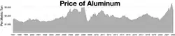 The price of aluminium was 80 US cents per lb in 1995 and 45 cents per lb in 1998 and hovered around this until the January 2003, when it started to rise to $1.50 per pound and in 2006 and $1.40 per lb in the December 2007.[89][90] It collapsed down to a mere 60 cents per lb in the November 2008, but is now hovering at about $1.00 per lb, with a new April peak of $1.10 per pound of aluminium.[89][90]