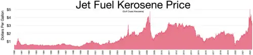 Hurricane Katrina caused Jet fuel prices to rise in 2005 because of slowed down refining in the Gulf Coast area, those prices dipped and the price of jet fuel went up with the price of oil through 2008. [58]