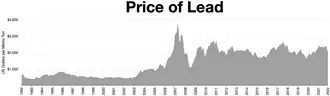 The price of lead rose sharply in early 2007, then collapsed to nearly their original starting price by the end of the next year.[107] Lead prices began to rise in early 2007 due to increased worldwide demand. Prices were about $1,200 per tonne of lead in the July, then rose to $2,220 per tonne by September and collapsed back down to $1,200 per tonne in the October of that year. Despite the bullish market condition, the price had collapsed by the July 2009 and was only worth about $1,400 per tonne of lead.[108] The lead and zinc markets became rather bearish for several months afterwards. Prices were hovering at between $1,770 and $2,175 per tonne[109] as the markets became more bullish and increased prices after China's car scrapping scheme had caused a general upturn in lead, zinc, cadmium and aluminium production.[109][110] By the June 2010, prices stood at only $870 per tonne, and were back to about $2,200 in the July 2010.[110][111][112][113]
