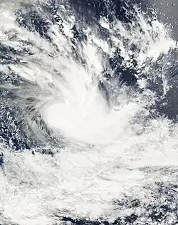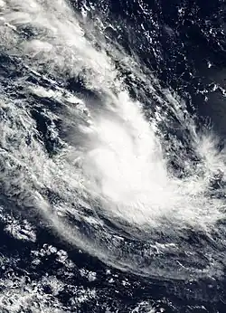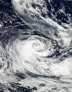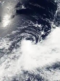 In Gary Pagett's April 2002 monthly tropical cyclone summary, he noted a possible tropical cyclone over the southeast Pacific that displayed features of a tropical or subtropical cyclone.[18] Operationally, the Tropical Cyclone Warning Center in Wellington, New Zealand only issued gale warnings on the system as it was not assessed to have been tropical or subtropical.[19] The system was later studied by Dr. Karl Hoarau of Cergy-Pontoise University in France and is believed to have been a tropical storm.[18] At the end of March, an upper-level trough associated with a cold front developed over the southeast Pacific Ocean. By March 31, a low-level circulation had developed roughly 600 km (370 mi) east of the Pitcairn Islands. Despite moderate wind shear, the system intensified and became a tropical depression early on April 1. Owing to a subtropical ridge to the north, the depression tracked west-southwestward into an area of decreased shear. Subsequently, the system was able to intensify into a tropical storm by the evening of April 2. Though the storm remained shear, throughout April 3 with convection remaining within half a degree of the center of circulation.[19] During the evening hours, an eye-like feature appeared on satellite imagery, and the system simultaneously was estimated to have reached again a peak intensity, but now as a subtropical storm.[20] Hours later, dry air became entrained in the storm's circulation and caused it to rapidly weaken to a subtropical depression. By the afternoon of April 4, the low had become fully exposed and the system was no longer classified a subtropical or tropical cyclone.[19]