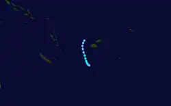 In addition to the storms listed above, the FMS monitored several weak tropical depressions and a tropical disturbance throughout the season. On December 8, Tropical Depression 02F developed near Fiji.[21] Tracking westward, the system attained a peak intensity of 45 km/h (28 mph) with a minimum pressure of 1000 mbar (hPa; 29.53 inHg) before weakening took place.[22] By December 10, the system transitioned into an extratropical cyclone.[21] Over the following several days, the remnants of the depression drifted southeastward and were last noted on December 15 to the southeast of Fiji.[22] On January 15, Tropical Depression 06F formed about 835 km (519 mi) west-northwest of Nouméa, New Caledonia. Embedded within a monsoon trough,[11] the system tracked generally eastward and attained peak winds of 65 km/h (40 mph).[12] The strongest winds were located well to the south of the system in a peripheral band. By January 16, the system began weakening as it interacted with a frontal system near New Caledonia before completely losing its identity later that day.[11] On January 20, a large tropical depression, designated 07F, formed about 325 km (202 mi) northwest of Fiji. A monsoonal system, the depression failed to organize a definite center and relocated several times throughout its existence. Between January 21 and 24, gale warnings were issued in association with the cyclone due to a strong pressure gradient between it and an anticyclone to the south.[11] Tracking generally southwestward, the system slowly deepened, attaining a minimum pressure of 997 mbar (hPa; 29.44 inHg) early on January 27 before the FMS discontinued advisories on the storm.[11][23]