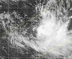 On December 31, the FMS began monitoring a new tropical depression, classified as 05F, roughly 600 km (370 mi) east-northeast of the Solomon Islands. A large system, similar to a monsoonal depression, 05F drifted southeastward for several days before turning towards the southwest.[11] On January 1, the system attained its peak intensity with winds of 65 km/h (40 mph) and a pressure of 998 mbar (hPa; 29.47 inHg).[12] Despite having gale-force winds, the system was not classified as a tropical cyclone since the winds were significantly displaced from the center of circulation. The JTWC determined the system had a good chance of developing into a tropical cyclone and issued a Tropical Cyclone Formation Alert (TCFA); however, this was later canceled as the depression failed to strengthen. By January 6, the system crossed 160°E and entered the Australian Bureau of Meteorology's area of responsibility.[11]