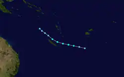 Early on March 13, a persistent area of convection, accompanied by a weak low-level circulation, was noted roughly 520 km (320 mi) west of Vanuatu. Situated underneath an upper-level ridge, the system experienced weak to moderate shear and had a favorable outflow. Later that day, the FMS began monitoring the system as Tropical Depression 13F. Early on March 14, the JTWC issued a TCFA and later their first advisory on Tropical Storm 19P as deep convection increased in coverage and organization around the low. The system tracked generally southeastward throughout its life in response to a low to mid-level ridge to its north-northeast.[16] Both the FMS and JTWC estimated peak winds at 65 km/h (40 mph) as passed close to New Caledonia.[12][17] Although the system passed close to the island, there were no reports of damage. After brushing New Caledonia, the system passed south of the ridge and experienced stronger shear, displacing convection to the southeast. By March 16, the system quickly weakened due to the combined effects of shear and decreasing sea surface temperatures. The system dissipated later that day well to the south of Fiji.[16]