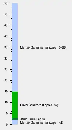 The track was entirely dry by lap 47 as Coulthard lowered the deficit behind Barrichello to 4.5 seconds. One lap later, Häkkinen set the race's overall fastest lap, at 1 minute 40.962 seconds, as he pursued Ralf Schumacher in fifth.[56] However, he did not have enough traction exiting the corners to pass Ralf Schumacher, whose more powerful engine gave him a straight-line speed advantage on the main straights, but emitted a large amount of carbon brake dust each time he braked into the heavy braking zones.[47][48] Michael Schumacher reduced his pace since overtaking caused by blocked radiators was a possible worry for him but maintained the lead to take his second victory of the season,[41][60] and the 46th of his career, overtaking Nigel Mansell's and Ascari's joint record of five victories in a row from pole position with his sixth.[51] Barrichello was 23.660 seconds behind in second and Coulthard came third.[46][2] Frentzen's scheduled two-stop strategy put him fourth despite locking rear wheels and was ordered by Jordan to stop at the end of the pit lane barrier because he needed to have enough fuel in his car to pass a post-race FIA analysis.[41][54] Ralf Schumacher in fifth held off Häkkinen in sixth. Outside of the points-scoring positions, Verstappen, Trulli, Alesi, Burti, Button and Mazzacane followed in positions seven to twelve.[2][51] The Minardi cars were the final two finishers, Alonso ahead of Marques; the latter was delayed by a right-rear puncture.[61]