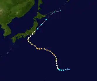 Tropical Depression 09W developed from an area of convection about 1,000 km (620 mi) to the east of Iwo Jima on July 21. Continued consolidation of its convection prompted both the JTWC to classify it as a tropical storm on 18:00 UTC.[27] The JMA followed suit six hours later and named it Kong-rey.[13] By July 23, the JTWC upgraded Kong-rey to a typhoon while the JMA upgraded it to a severe tropical storm.[13][11] A mid-latitude ridge to the east of Japan strengthened, causing Kong-rey to curve and move in a northeastward direction.[27] Kong-rey reached its peak intensity on July 25, then slightly weakened afterwards. At the same time, the JMA had finally upgraded Kong-rey to a typhoon.[13] On July 26, a redevelopment of a small eye caused Kong-rey to reach its second peak intensity for a short period of time. Its peak strength only maxed out to 10-minute sustained winds of 130 km/h (81 mph). Increasing wind shear caused the typhoon to weaken the next day. Kong-rey was downgraded to a tropical storm on 00:00 UTC of July 28.[27] Both agencies issued their final warning later that day when it had become extratropical.[13][11] Its remnants was still tracked until it reached the southwestern Aleutian Islands on August 3.[27]