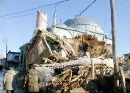 ![]() A collapsed building and a damaged mosque in Sultandağı | |