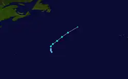 A tropical wave exited the African coast on August 27,[35] and with low favorable conditions the system organized into Tropical Depression Four on August 29 about 630 mi (1,010 km) southwest of Cape Verde.[36] Six hours later, the depression was upgraded to Tropical Storm Dolly after developing sufficient outflow and curved banding features.[37] The storm continued to intensify as more convection developed,[38] and Dolly reached peaked winds of 60 mph (97 km/h) on August 30.[35] After peaking in intensity, the storm suddenly lost organization,[39] and the winds decreased to minimal tropical storm force.[40] After a brief re-intensification trend, Dolly again weakened due to wind shear. On September 4, Dolly weakened to a tropical depression, and later that day was absorbed by the trough; it never affected land.[35]