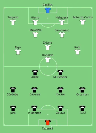 Ronaldo opened the scoring for Real Madrid in the 14th minute shooting low right footed past the goalkeeper from inside the penalty box. The second goal was scored by Guti in the 84th minute, heading home at the near post after a cross from Luís Figo on the right.[4]