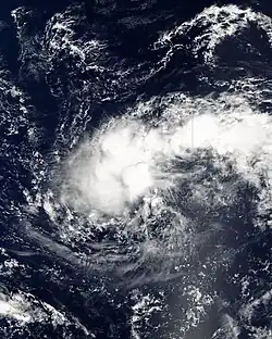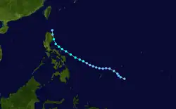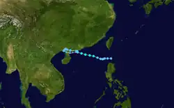 On March 15, the JTWC began monitoring a tropical disturbance, and four days later upgraded it to a tropical depression near Palau.[11][21] The next day, both the JMA and PAGASA classified the system as a depression, and PAGASA named it "Caloy".[23] Moving west-northwestward due to a ridge to the north,[11] the depression moved across the Philippine island of Mindanao on March 21 and continued through the archipelago.[21] Owing to strong wind shear, the system never intensified,[11] and the JMA discontinued advisories on March 23 after the system reached the South China Sea.[23] The JTWC maintained the system as a tropical depression until March 25, when a mid-latitude trough absorbed the system off the east coast of Vietnam.[11]