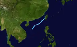 A tropical depression formed in the South China Sea on May 28,[11] given the name "Dagul" by PAGASA.[26] The JTWC never anticipated significant strengthening,[28] and the system largely consisted of convection displaced to the southeast of a broad circulation.[26] A ridge to the southeast steered the depression to the northeast, and on May 30 the depression made landfall in southwestern Taiwan. The combination of land interaction and wind shear caused dissipation that day.[11]
