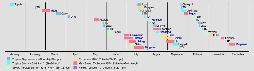 The 2002 Pacific typhoon season was a slightly above average Pacific typhoon season, producing twenty-six named storms, fifteen becoming typhoons, and eight super typhoons. It had an ACE over 400 units, making it one of the most active seasons worldwide. It was an event in the annual cycle of tropical cyclone formation, in which tropical cyclones form in the western Pacific Ocean. The season ran throughout 2002, though most tropical cyclones typically develop between May and November. The season's first named storm, Tapah, developed on January 11, while the season's last named storm, Pongsona, dissipated on December 11. The season's first typhoon, Mitag, reached typhoon status on March 1, and became the first super typhoon of the year four days later.