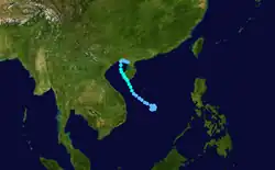 The season began early, but did not become active until June, when six storms passed near or over Japan after a ridge weakened.[10] Nine storms developed in July, many of which influenced the monsoon trough over the Philippines to produce heavy rainfall and deadly flooding.[12] The flooding was worst in Luzon, where 85 people were killed. The series of storms caused the widespread closure of schools and offices. Many roads were damaged, and the floods left about $1.8 million (₱94.2 million PHP)[nb 5] in crop damage, largely to rice and corn.[13] Overall damage from the series of storms was estimated at $10.3 million (₱522 million PHP).[14][nb 5] From June to September, heavy rainfall affected large portions of China, resulting in devastating flooding that killed over 1,500 people and left $8.2 billion (¥68 billion CNY) in damage.[15][nb 6] During this time, Tropical Storm Kammuri struck southern China with a large area of rainfall that damaged or destroyed 245,000 houses. There were 153 deaths related to the storm, mostly inland in Hunan,[17] and damage totaled $322 million (¥2.665 billion CNY).[18][nb 6] Activity shifted farther to the east after September, with Typhoon Higos striking Japan in October and Typhoon Pongsona hitting Guam in December.[10]