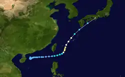Rammasun was the first of four typhoons to contribute to heavy rainfall and deadly flooding in the Philippines in July; there were 85 deaths related to the four storms,[14] with 2,463 homes damaged or destroyed.[24] Rammasun developed around the same time as Typhoon Chataan, but farther to the west. The storm tracked northwestward toward Taiwan, and on July 2 it attained its peak intensity with winds of 155 km/h (96 mph). Rammasun turned northward, passing east of Taiwan and China.[12] In Taiwan, the outer rainbands dropped rainfall that alleviated drought conditions.[33] In contrast, rainfall in China followed previously wet conditions, resulting in additional flooding,[34] although less damage than expected; there was about $85 million in crop and fishery damage in Zhejiang.[35][nb 6]