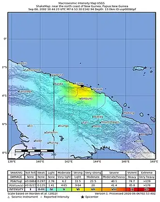 The earthquake was the largest in mainland Papua New Guinea since 1938.[5] The United States Geological Survey reported a magnitude of ML 7.4,[6] Mw 7.6 or Me 7.7.[2] It was caused by a rupture on a low-angle thrust fault in the New Guinea Trench,[7] with the rupture occurring on a steep, northwest-striking reverse fault or on a moderately dipping, southeast-striking reverse fault.[2] A fault measuring 72 km (45 mi) in length, and 36 km (22 mi) wide ruptured with a maximum slip of 2.1 m (6.9 ft).[7] A Modified Mercalli intensity of X (Extreme) was estimated,[4] with MMI VI (Strong) shaking recorded in Wewak, Kairiru, Ambunti and Angoram in East Sepik, and Aitape in Sandaun; MMI IV-V (Light-Moderate) was estimated to have been felt in Keerom and Jayapura in eastern Indonesia. ShakeMap perimeters estimate that shaking may have been felt as far away as the towns of Lae and Kerema.[2]