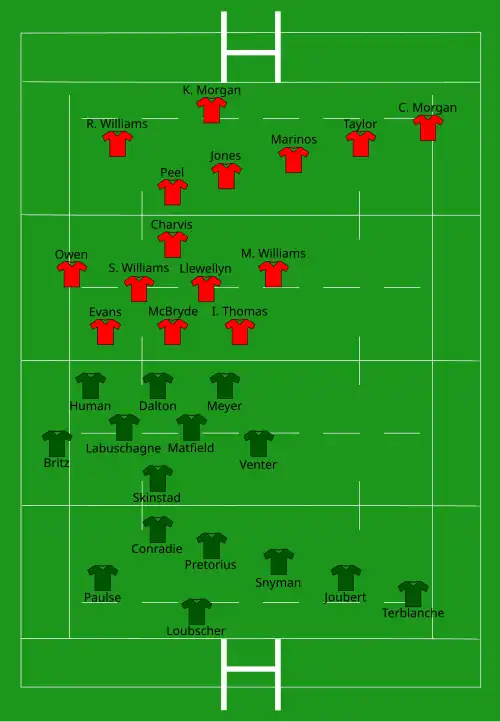 In the first test, Wales led after the first 20 minutes, but tries from Marius Joubert and Bobby Skinstad gave the first advantage (15-11) for the victorious Springboks.[26]