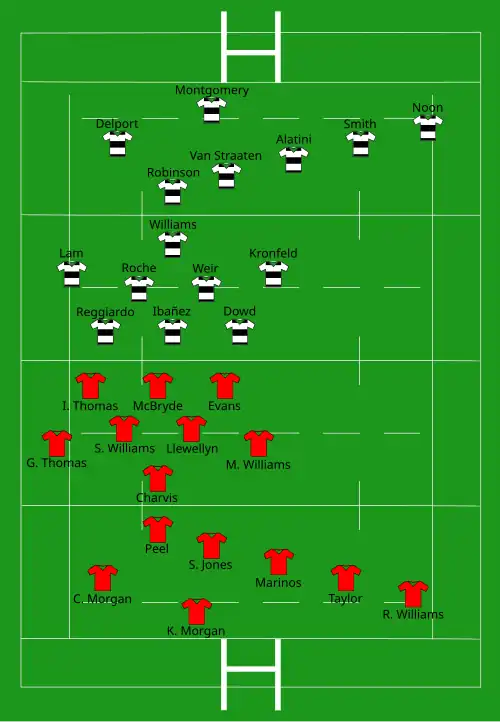 | Try: Taylor C. Morgan G. Thomas Con: Jones (2) Pen: Jones (2) | Report | Try: Smith Delport (2) Garvey (2) Lam Con: Van Straaten (5) |