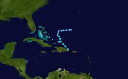 A strong tropical wave moved off the coast of Africa on August 14,[56] and after tracking steadily westward an area of convection began to become better organized on August 18.[57] After it tracked through the Lesser Antilles, it developed into Tropical Depression Nine on August 21 to the south of Puerto Rico. The depression quickly showed signs of organization, and forecasters predicted the depression to intensify to a strong tropical storm.[58] However, strong southwesterly wind shear unexpectedly became established over the system, and the depression degenerated into a tropical wave late on August 22 to the south of the eastern tip of the Dominican Republic.[56]