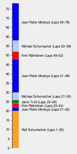 After four laps behind the safety car to let the marshals clear the track, the race continued and the top three escaped from the rest of the pack, mainly due to Trulli's cautious pace. Montoya put heavy pressure on his leading teammate, running less than half a second behind when Schumacher made his pit stop. The Colombian made use of the clean air on just one lap. He immediately set the fastest lap time of the race and after his stop, rejoined just in front of his teammate. To make matters worse for the German, Räikkönen also appeared ahead him after the Finn had pitted. Michael Schumacher overtook Trulli through the pit stop phase and David Coulthard got ahead of Alonso.[18][23]
