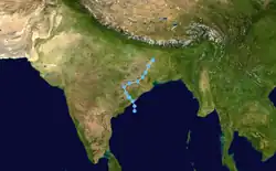 A low pressure area persisted over the northern Bay of Bengal on July 22, eventually organizing into a depression on July 25 about 160 km (99 mi) south of Kolkata. Moving northwestward, the system quickly intensified into a deep depression,[1] with peak winds estimated at 55 km/h (35 mph). Late on July 25, the system made landfall north of Balasore in Odisha state.[18] It progressed inland across India, weakening to depression status but remaining a distinct system. On July 28, the depression degenerated into a remnant low over Rajasthan in northwestern India, later merging with a heat low. Rainfall associated with the system mostly occurred in the southwestern periphery, with a peak of 250 mm (9.8 in) at Kendrapara; there was little damage.[1] Rainfall also spread into Bangladesh.[2]