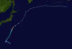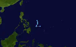 On January 11, the JTWC began monitoring the disturbance that would eventually develop into Yanyan near the International Date Line. As the system tracked westward, it gradually moved into a more favorable environment for tropical cyclogenesis. On January 14, surface observations indicated that the low-pressure area had developed a closed, low-level circulation center indicative of a tropical cyclone, satellite imagery remained inconclusive.[30] Nonetheless, the JMA classified the pressure area as a tropical depression west of the Marshall Islands at 0600 UTC on January 15.[12] The JTWC would follow suit by classifying the storm as such at 1800 UTC later that day. At the time, the depression was tracking west-northwest under the influence of a subtropical ridge to the north.[13] Over the next day the system waned in convective activity before resuming its previous track and accelerating. At 0000 UTC on January 17, the JTWC upgraded the system to tropical storm intensity, though the storm remained nameless as the JMA continued to classify it as a tropical depression.[12][30]