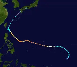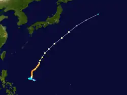 A tropical disturbance persisted in the monsoon trough northwest of Pohnpei on June 7, and moved westward without development due to wind shear.[18] On June 11, the shear decreased enough to allow the convection to organize,[13][18] and the next day the JMA classified it as a tropical depression northeast of Palau. On June 13, the JMA upgraded it to Tropical Storm Soudelor to the east of the Philippines,[12] and PAGASA gave it the local name "Egay".[50] Soudelor moved to the northwest and later to the north, parallel to the eastern Philippines, and on June 17, the JMA upgraded it to typhoon status.[12] The storm rapidly intensified to the east of Taiwan as it developed a well-defined eye,[18] and while doing so passed over the Japanese island of Iriomote-jima at around 2030 UTC on June 17.[12] At 0600 UTC on June 18, the JTWC estimated peak 1 minute winds of 215 km/h (134 mph),[13] while the JMA estimated peak 10 minute winds of 150 km/h (93 mph).[12] Increased shear weakened the typhoon to tropical storm strengthen on June 19, and later that day the JMA declared the storm as extratropical near the Oki Islands. The extratropical remnants of Soudelor continued to the northeast, crossing northern Japan on June 20 and dissipating on June 24.[12]
