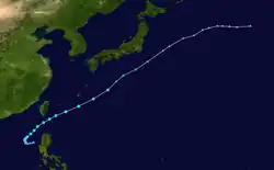 Kujira developed from a broad area of disturbed weather as a tropical depression on April 9 well removed from any landmasses.[13] Shortly after development, Kujira quickly intensified in its early stages, and was upgraded to a tropical storm just two days after cyclogenesis. Strengthening slowed afterwards, though the storm attained typhoon intensity on April 14. Intensification continued and late on April 15, Kujira reached its peak intensity with winds of 165 km/h (103 mph) and a minimum barometric pressure of 930 mbar (hPa; 27.46 inHg).[12] Following peak intensity, Kujira would begin to track northwest and oscillate in strength, cresting an additional two times in intensity. On April 21, the typhoon was downgraded to tropical storm intensity and began to track erratically for several days east of Taiwan. However, on April 24, Kujira would resume a northward track and begin to weaken, and on April 24 was downgraded to tropical depression strength as it made landfall on Kyushu.[13] Following landfall, Kujira transitioned into an extratropical cyclone on April 25, which persisted until crossing the International Dateline towards the end of April 2003.[17]