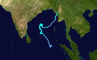 After peaking in intensity, the storm began weakening due to increasing easterly wind shear from the ridge to the north, displacing the center of circulation from the deepest convection.[2][5] Early on May 14, the IMD downgraded the storm to a severe cyclonic storm.[3] Around this time, steering currents slackened, and the cyclone meandered northward over the central Bay of Bengal. By late on May 14, convection had largely dissipated, with the exception of a small area near the center,[2] and the system weakened to minimal cyclonic storm status. Thunderstorm activity continued to wax and wane as the storm turned to the southeastward, though persistent hostile conditions caused the storm to weaken further to a deep depression on May 16. As the nearby ridge translated eastward, the depression was able to move more steadily to the east and later to the northeast, passing northwest of the Andaman Islands on May 18.[2][10] On the next day, the deep depression re-intensified into a cyclonic storm, reaching a secondary peak with winds of 85 km/h (55 mph).[3][10] At about 10:00 UTC on May 19, the storm made landfall close to Kyaukpyu, Ramree Island, in western Myanmar.[2][5] The storm rapidly weakened into a depression and later degenerated into a low-pressure area on May 20,[3] and was no longer discernible on satellite imagery by the next day.[2]
