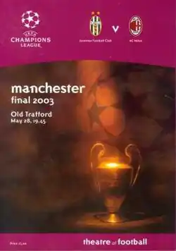 The 2003 UEFA Champions League final was a football match that took place at Old Trafford in Manchester, England on 28 May 2003 to decide the winner of the 2002–03 UEFA Champions League. The match was contested by two Italian teams: Juventus and Milan. The match made history as it was the first time two clubs from Italy had faced each other in the final. It was also the second intra-national final of the competition, following the all-Spanish 2000 UEFA Champions League final between Real Madrid and Valencia three years earlier. Milan won the match via a penalty shoot-out after the game had finished 0–0 after extra time. It gave Milan their sixth success in the European Cup.