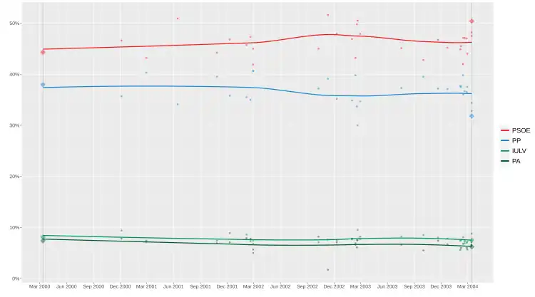 - ^ a b "El PSOE mantiene su ventaja de ocho puntos sobre el PP para las elecciones autonómicas". El País (in Spanish). 31 January 2004.