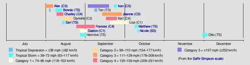 Tropical cyclogenesis began at the end of July, with the development of Hurricane Alex on July 31.[12] However, it did not become a named storm until the following day, which was the fifth-latest start since the 1952 season.[17] August was an unusually active month, with eight named storms, including Alex, Bonnie, Charley, Danielle, Earl, Frances, Gaston, and Hermine.[12] This broke the record for the most named storms in the month of August set in 1933 and 1995.[18] This new record was tied in 2012. On average, there are only three tropical storms and one to two hurricanes in August.[19] Of the eight systems that month, five became hurricanes and three strengthened further into major hurricanes. A total of five tropical cyclones developed in September, including the most intense system of the season, Hurricane Ivan. Activity decreased further in October, with the formation of only two systems, Tropical Storm Matthew and Subtropical Storm Nicole. The season then went dormant for over a month and a half, until Tropical Storm Otto developed on November 29. Otto was the final tropical cyclone of the season and degenerated into a remnant low pressure on December 3.[12]
