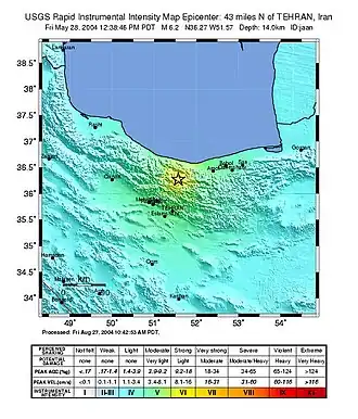 The 2004 Baladeh earthquake occurred on May 28 in northern Iran. This dip-slip earthquake had a moment magnitude of 6.3 and a maximum Mercalli intensity of VIII (Severe). Total deaths for the event amounted to 35, with 278–400 injured, and $15.4 million in damage.