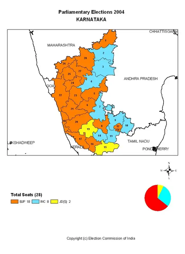 The 2004 Indian general election in Karnataka, occurred for 28 seats in the state. Of the 28 seats, 24 belonged to the general category and 4 were belonging to SC category.[1]