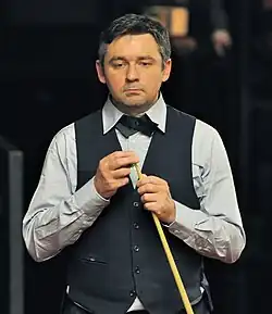 Ken Doherty compiled breaks of 89 and 81 to hold a 3–1 advantage over his opponent Steve Davis at the mid-session interval of their first round match. Davis denied Doherty an early victory in frame seven when he potted the last four coloured balls to snatch the frame; he also took the next frame to reduce his deficit to 3–5.[18] However, a 33 break from Doherty ended the match 6–3 in his favour, after more than 3 and a half hours of play.[18][19] Afterwards, Davis complained about cold air entering the venue, which dampened the cloth and caused the chalk to stick to the cue ball.[19] Stephen Lee took the first frame of his match against Ding Junhui, who won the next three frames—with the help of an 84 break—for a 3–1 lead at the interval.[20] Following Lee's fifth frame win, Ding compiled breaks of 81, 83, and 89, to go 5–2 ahead, but Lee responded to claim frame eight on a re-spotted black ball, before taking the ninth with a clearance of 54. Lee also took the tenth frame to force a final frame decider; he then made a break of 85 in the last frame to claim a 6–5 victory, booking his place in the quarter-finals.[21][22]