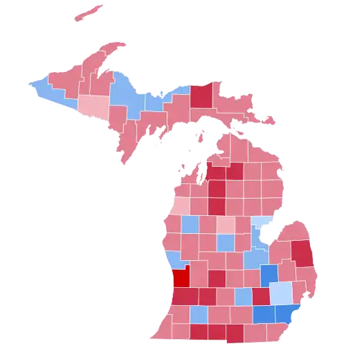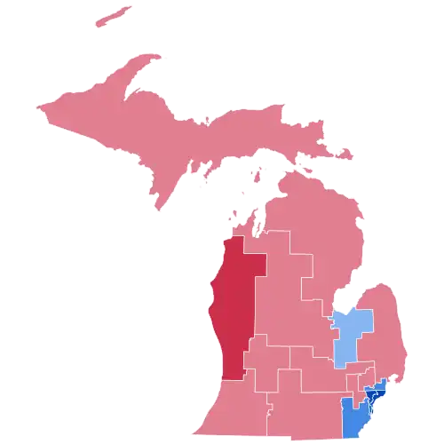 Kerry won Michigan with 51.2% and by a margin of 3.4%. While a reduced margin with respect to Gore's in 2000, the state trended Democratic in 2004 relative to the nation.[8] Bush won a majority of the state's counties and congressional districts, holding Kerry to only 15 counties (whereas Gore had carried 24). But he underperformed previous Republicans in two large suburban counties that had recently been Republican strongholds in the state, Oakland and Macomb Counties. Kerry narrowly held onto Oakland County, which has a more white-collar populace and had voted Republican in every election from 1940 through 1992 save 1964, and had voted to re-elect Bill Clinton in 1996 by only 4.3%. Bush did flip the more blue-collar Macomb County, which Gore had become the second Democrat to carry after a twenty-year run of voting Republican from 1972 through 1992, but he carried it by only 1.4%, making it still slightly bluer than the nation. Meanwhile, Kerry maintained the traditional Democratic domination of Wayne County, winning about the same 69% vote share in it that Gore had won in 2000. Michigan had voted Republican in every election from 1972 through 1988, in all of which Oakland and Macomb had given the Republican a healthy margin.