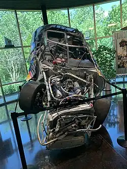 The remains of Kluever's destroyed car on display at RFK Racing's museum.