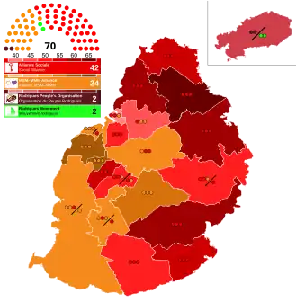 The National Assembly consisted of 60 members elected from three-seat constituencies in mainland Mauritius by multiple non-transferable vote, two members elected from a two-seat constituency (the island of Rodrigues) by the same systenm, and up to eight "best loser" seats appointed to ensure that ethnic and religious minorities are equitably represented.