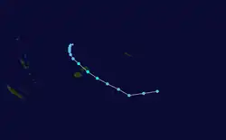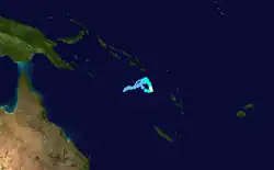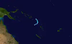 The FMS subsequently estimated during October 24, that the system had peaked as a Category 4 Severe Tropical Cyclone with 10-minute sustained wind speeds of 175 km/h (110 mph), while it was located about 220 km (135 mi) to the east of Vanua Lava in northern Vanuatu.[5][6] The JTWC also estimated during October 24, that the system had peaked with 1-minute sustained wind speeds of 215 km/h (135 mph), which made it equivalent to a category 4 hurricane on the Saffir-Simpson hurricane wind scale.[7] Over the next day the system maintained its peak intensity as it moved south-eastwards, before it turned westwards during the next day towards Vanuatu and rapidly weakened after it moved into an area of cooler sea-surface temperatures and strong vertical wind-shear.[5][6][10] As a result, during October 26, The FMS and JTWC both reported that the system had weakened into a tropical depression, before the systems remnants were last noted by the FMS during October 28.[5][12] On the Santa-Cruz Islands of Utupua and Vanikolo some minor tree damage was reported, while extensive damage to food crops occurred at Tikopia.[5][10] However, Radio New Zealand reported that overall damage at Tikopia was considered to be light given the circumstances.[10] Strong and gusty winds, rough seas and moderate to heavy swells were reported within the eastern Vanuatuan islands, however, no significant damage was reported within the islands.[5][10]