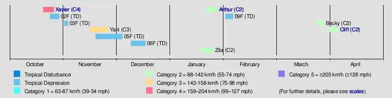 | 15 systems | October 21 – April 6 | 175 km/h (110 mph) | 930 hPa (27.46 inHg) | |||||