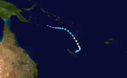 Late on November 16 a weak tropical disturbance formed to the north-west of Tuvalu embedded within the South Pacific Convergence Zone.[5][19] The disturbance did not have any organised convection near the low level circulation centre and was located in an area of low vertical wind shear.[19] Early the next day whilst the organisation of the system had not improved much, there had been enough of an increase in convection in the northern and southern quadrants for RSMC Nadi to designate the disturbance as Tropical Depression 04F.[20] Over the next couple of days the depression gradually moved towards the south-west before the low level circulation center was relocated to the north of Vanuatu early on November 19.[21][22] The depression continued to gradually develop, with a Tropical Cyclone Formation Alert being issued late on November 21 as convection had erupted about the low level circulation centre with bands of convection wrapping around the low level circulation significantly.[5][23][24][25]