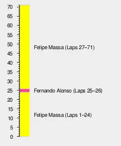 The race now settled into a steady pattern with the Ferraris still quickest and Alonso closing to within two seconds of Räikkönen's McLaren. Coulthard retired his Red Bull-Ferrari with mechanical problems on lap 14. The first planned pitstops took place on lap 21 with Räikkönen, Fisichella and Barrichello all coming in for fuel and tires. Fisichella's stop was slightly slower than Barrichello's, which nearly resulted in a collision as the two exited the pitlane - the Renault driver only just maintaining his position. They reemerged on the track 7th, 8th and 9th respectively, just behind de la Rosa and Heidfeld who had hitherto been contesting 8th place with Heidfeld quicker in the corners but unable to match the McLaren's straight-line speed. Massa closed to within a couple of seconds of lapping his teammate, setting a fastest lap of 1:12.8 before pitting on lap 23 at which point he had a 15-second gap to Alonso in second. Massa was stationary for just over 8 seconds and rejoined in third behind Button who was now in second despite having started 14th. Button pitted on the next lap, his 7.9 second stop allowing him to rejoin in 7th comfortably ahead of Fisichella and Barrichello. Alonso made his stop on the following lap and was able to rejoin just in front of Räikkönen but still behind de la Rosa and Heidfeld. Kubica then pitted from second position on lap 26 and dropped to 9th. His teammate followed suit on lap 27 falling behind the two Toro Rosso in the process just as Button was able to slipstream Räikkönen and outbrake him into turn one. Massa now led by 17 seconds in front of de la Rosa, who would not stop until 8 laps later. Alonso, Button and Räikkönen followed with a small gap back to Fisichella and Barrichello.