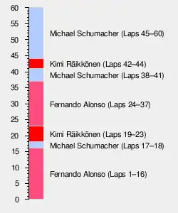 At the restart, Kimi Räikkönen passed Jenson Button for fourth but little else changed in the order. The front runners pitted on laps 17 and 18 and kept their relative positions. Alonso and Schumacher traded fastest laps until the Renault driver pitted on lap 38. The German was now in free air and pushed his Ferrari for three more laps. He rejoined the race a whopping five seconds ahead of his Spanish rival and managed to extend his advantage even further.
