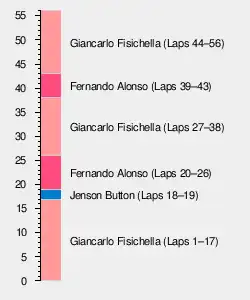 Fisichella went in for his first stop a couple of laps later, leaving Button in the lead until the Honda also dived in. That promoted Alonso to the front, but while the Spaniard went 10 laps further into the race than teammate Fisichella did before visiting the pits, he was still on a two-stopper.