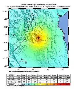 The 2006 Mozambique earthquake occurred at 22:19 UTC on 22 February. It had a magnitude of 7.0 on the moment magnitude scale and caused 4 deaths and 36 injuries. The epicenter was near Machaze in Manica Province of southern Mozambique, just north of the Save River. It was the largest historical earthquake in Mozambique and the first earthquake in southern Africa to have an identified surface rupture.[4]