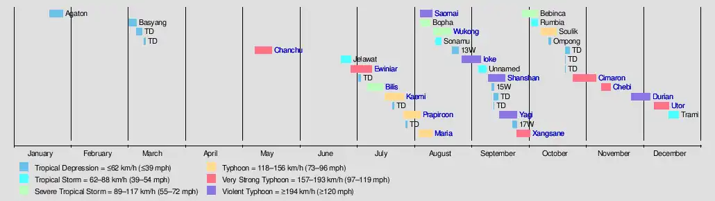 On September, an unnamed and unclassified tropical storm have been discovered by meteorologist Gary Padgett and Dr. Karl Hoarau. Later, Typhoon Xangsane affected Luzon, Philippines, causing major damages with more than 200 people dead.[11] The country saw four storms making landfall, with three of them reaching Category 4 or 5 super typhoon status. Typhoon Cimaron made landfall over in northern Luzon as a Category 5 super typhoon with minimal damages.[12] By November, Typhoon Chebi made landfall in the same area as Cimaron, though effects from the typhoon were much smaller than Cimaron. Although by late November, Typhoon Durian made landfall in Bicol region. Combined effects with ash from the Mayon Volcano had killed over 1,500 people and damages at least US$530 million. Durian also crossed the basin and into the North Indian Ocean basin, the first time since 2003. During early December, two systems formed. Typhoon Utor crossed Visayas with minimal damage; and Tropical Storm Trami, a very weak system that didn't affect any landmasses became the final tropical cyclone and dissipated on December 20.[1]
