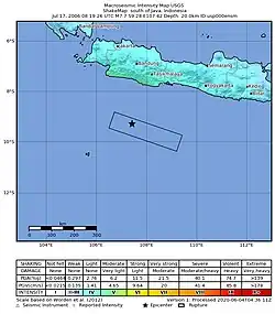 An earthquake occurred on July 17, 2006, at 15:19:27 local time along a subduction zone off the coast of west and central Java, a large and densely populated island in the Indonesian archipelago. The shock had a moment magnitude of 7.7 and a maximum perceived intensity of IV (Light) in Jakarta, the capital and largest city of Indonesia. There were no direct effects of the earthquake's shaking due to its low intensity, and the large loss of life from the event was due to the resulting tsunami, which inundated a 300 km (190 mi) portion of the Java coast that had been unaffected by the earlier 2004 Indian Ocean earthquake and tsunami that was off the coast of Sumatra. The July 2006 earthquake was also centered in the Indian Ocean, 180 kilometers (110 mi) from the coast of Java, and had a duration of more than three minutes.