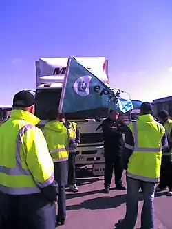 Progressive Enterprises workers, along with supporters, kept up continuous around-the-clock pickets at the distribution centres, as well as going out on "flying pickets" targeting the temporary distribution points set up by the company at supermarkets and distribution firms where people are handling goods that would normally be handled at the distribution centers.[13] at the Palmerston North distribution centre. A permanent presence was set up at the site, with tents, a power generator, fridge, barbecue and portaloo. A representative from the Postal Workers Union added a letterbox to the campsite, saying that postal workers would deliver messages of solidarity sent directly to the picketers.[14] Numerous arrests were made during the dispute, on 28 August union negotiator Stan Renwick was arrested;[15] in Lower Hutt three picketers who were not employed by Progressive Enterprises were arrested at a Countdown supermarket after a stand off with a truck driver.[16] During the third week of the dispute ten people were arrested on the picket line in Auckland after truck tires were punctured during a clash between picketers and a moving truck; National Distribution Union organiser Ingrid Beckers, who was one of the people arrested, told the New Zealand Herald that the truck had driven dangerously through the picket line and that the driver unwound his window and swung a metal pole around. According to Senior Sergeant Cornell Kluessien "Some were charged with disorderly behaviour, some with obstructing police and some with obstructing a roadway."[17]