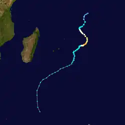 During the season, the MFR monitored 15 tropical disturbances, including a subtropical cyclone southwest of Madagascar that ended the season in April.[5][3] There were ten systems that attained the intensity of a moderate tropical storm, which has 10–minute sustained winds of at least 65 km/h (40 mph); this is near the long-term average, but much more active than the previous season. There were 58 days in which a tropical storm was active, or five more than the average. Seven of these storms attained tropical cyclone status, which has 10–minute winds of 120 km/h (75 mph); the 30 days with a tropical cyclone present was 10 days more than average. Of these cyclones, six strengthened further to an intense tropical cyclone, which has 10 minute winds of 165 km/h (105 mph). This was the most on record at the time,[6] until it was surpassed by the 2018–19 season.[7] The rest of the southern hemisphere was less active than the Indian Ocean during the 2006–07 cyclone year. The El Niño present at the beginning of the season subsided by January 2007.[6]